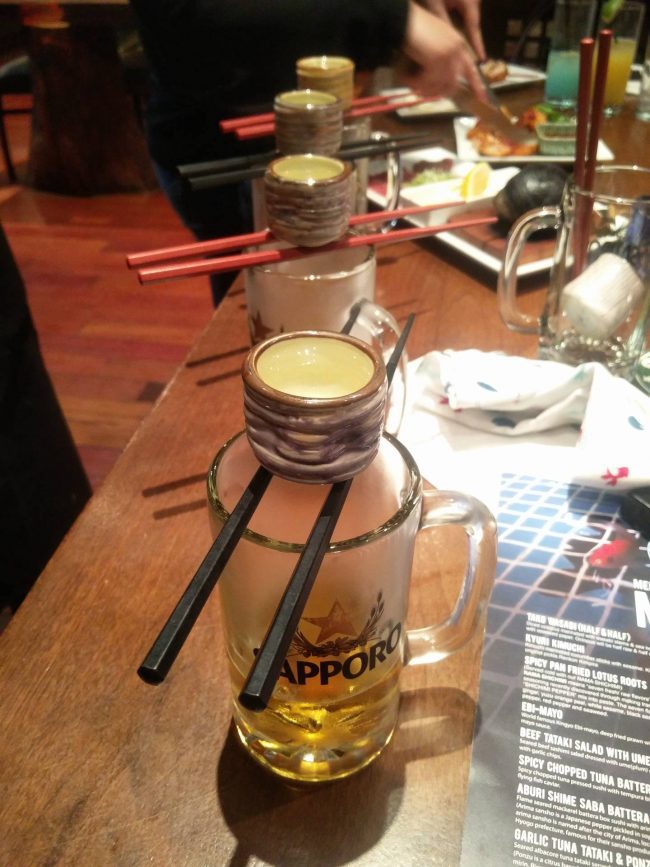 Then, a great *hulk smash* of the table. Yuki was a professional sake-bomb-smasher from her heavy experience with this beverage, all of us rookies couldn’t compare to her strength and quickness, Jagerbombs are not hard work at all.