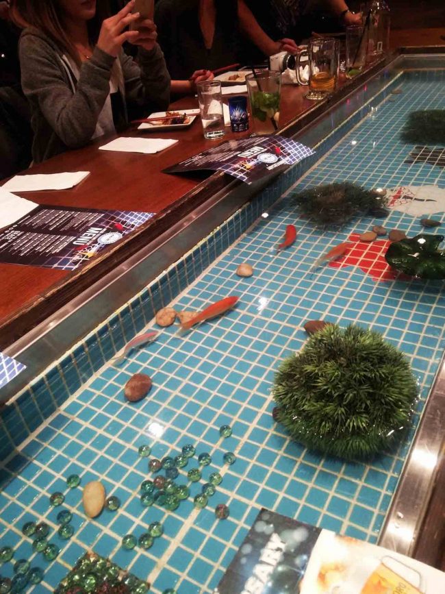 Kingyo, means “goldfish” in Japanese, and we were the lucky bunch that had a chance to dine at the in-built fish tank table thanks to a media tasting evening celebrating Kingyo’s 3rd anniversary organized by Yuki of pekopekolife. The night began with sake-bombs for all, a sake cup propped up by a pair of chopsticks and sploshed into a mug of 1/4 filled Sapporo after the chant of the Sake Bomb song: “Sake bomb, Sake bomb, Sake bomb bomb!”