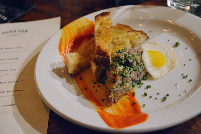 Steak Tartare, topped with a soft-boiled quail egg & served with grilled ciabatta – $20
