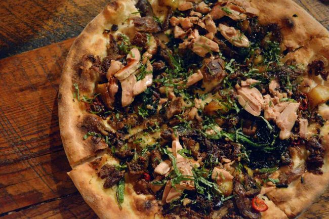 Double duck pizza, topped with duck confit, foie gras, rapini, apples & balsamic
