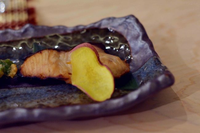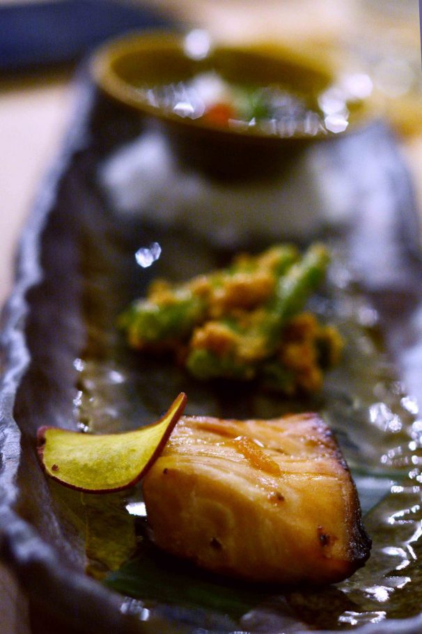 First course: Appetizers three-ways with marinated seaweed that’s sour and very appetizing, a green beans dish with miso and a grilled black cod next to that. The seaweed was really good and nothing like any other seaweed salads you can get! The cod was on the drier side but it was good too.